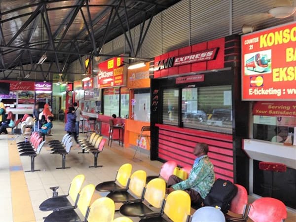 从吉隆坡前往红土坎的巴士登车地点位于吉隆坡大使路巴士站(Hentian Duta)。我们提前 30 分钟到达那里。这个巴士总站的设计非常简单,巴士站前拥有宽敞的候车区,而票务柜台则是在候车区后面。这些设施足以满足大使路巴士站乘客的需求。